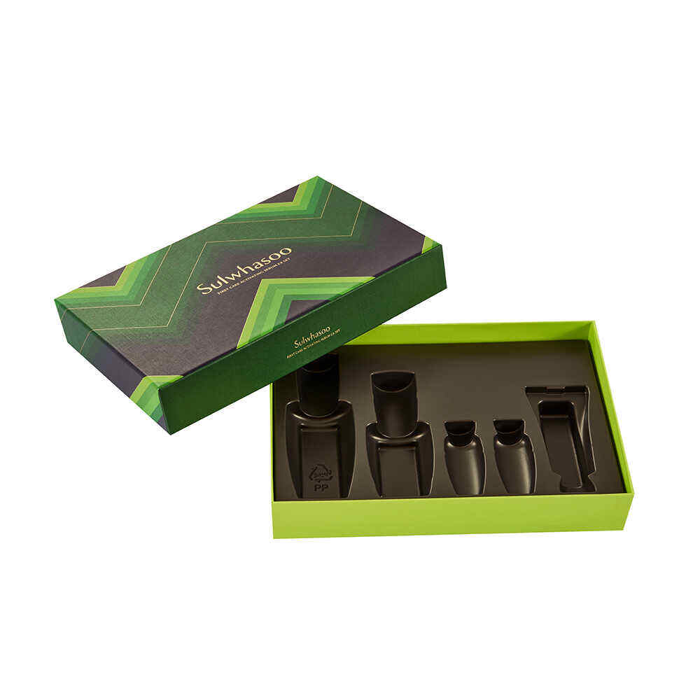 O interior apresenta um inserção personalizada em blister preto , moldado com precisão para manter firmemente no lugar frascos, potes ou tubos de produtos para a pele. A inserção escura cria um forte contraste visual contra o exterior verde, realçando a apresentação do produto enquanto garante excelente proteção durante o transporte e exposição.